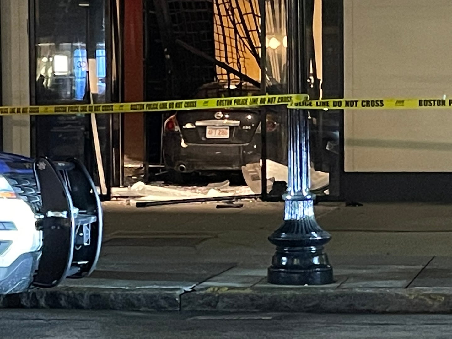 Boston Police were called to the location at 4:29 Friday morning and found an empty grey Nissan Altima inside of the store. Shattered glass covered the sidewalk.