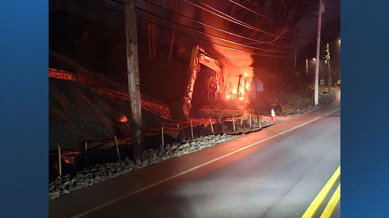 Hamilton shared photos of the excavator on Bridge Street engulfed in flames.