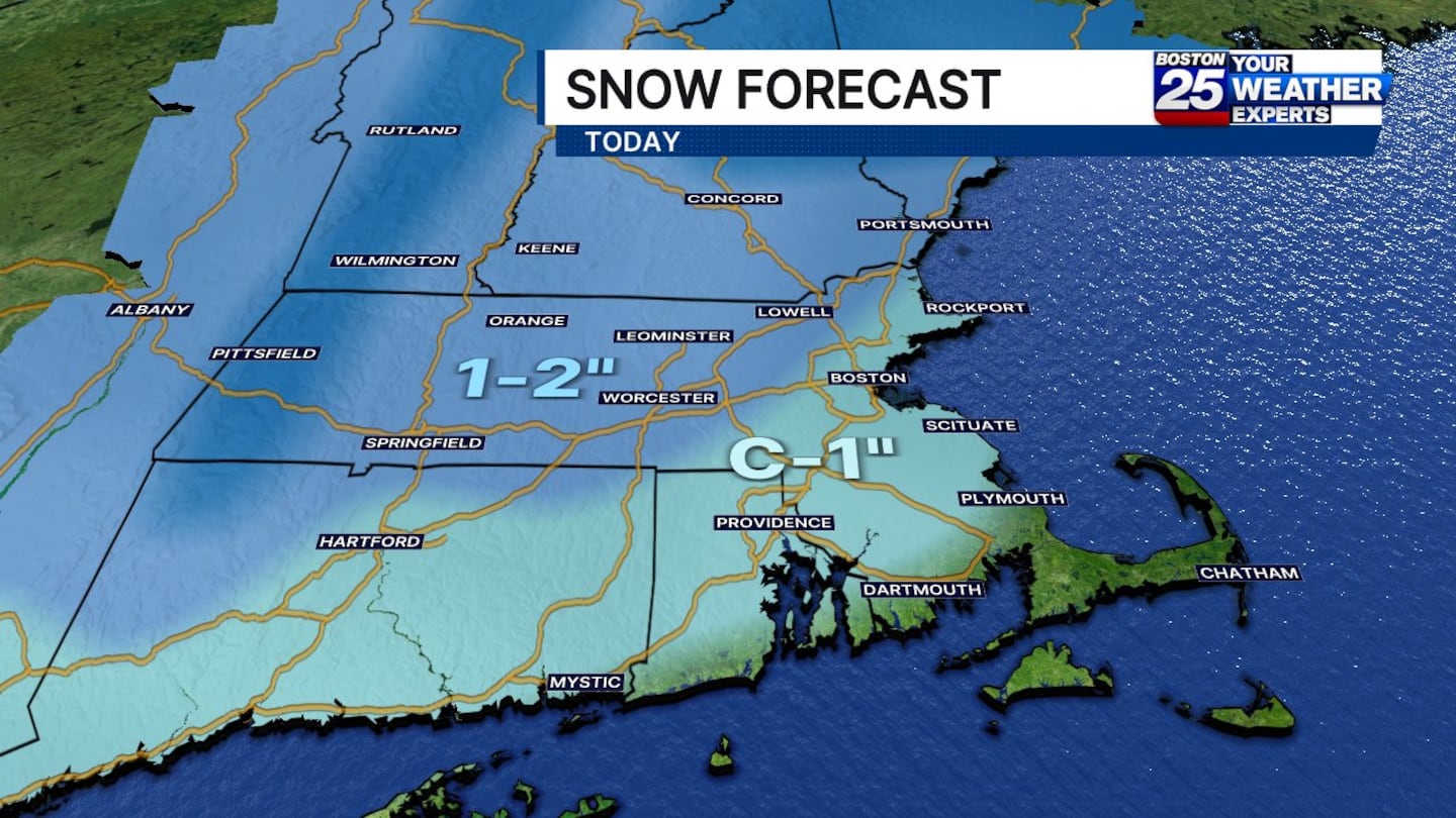 Inland areas north and west of Interstate 495 into the higher elevations, including the Merrimack Valley, Worcester County, and Western Massachusetts, will likely see 1 to 2 inches of snow. A few isolated spots could see slightly higher totals.