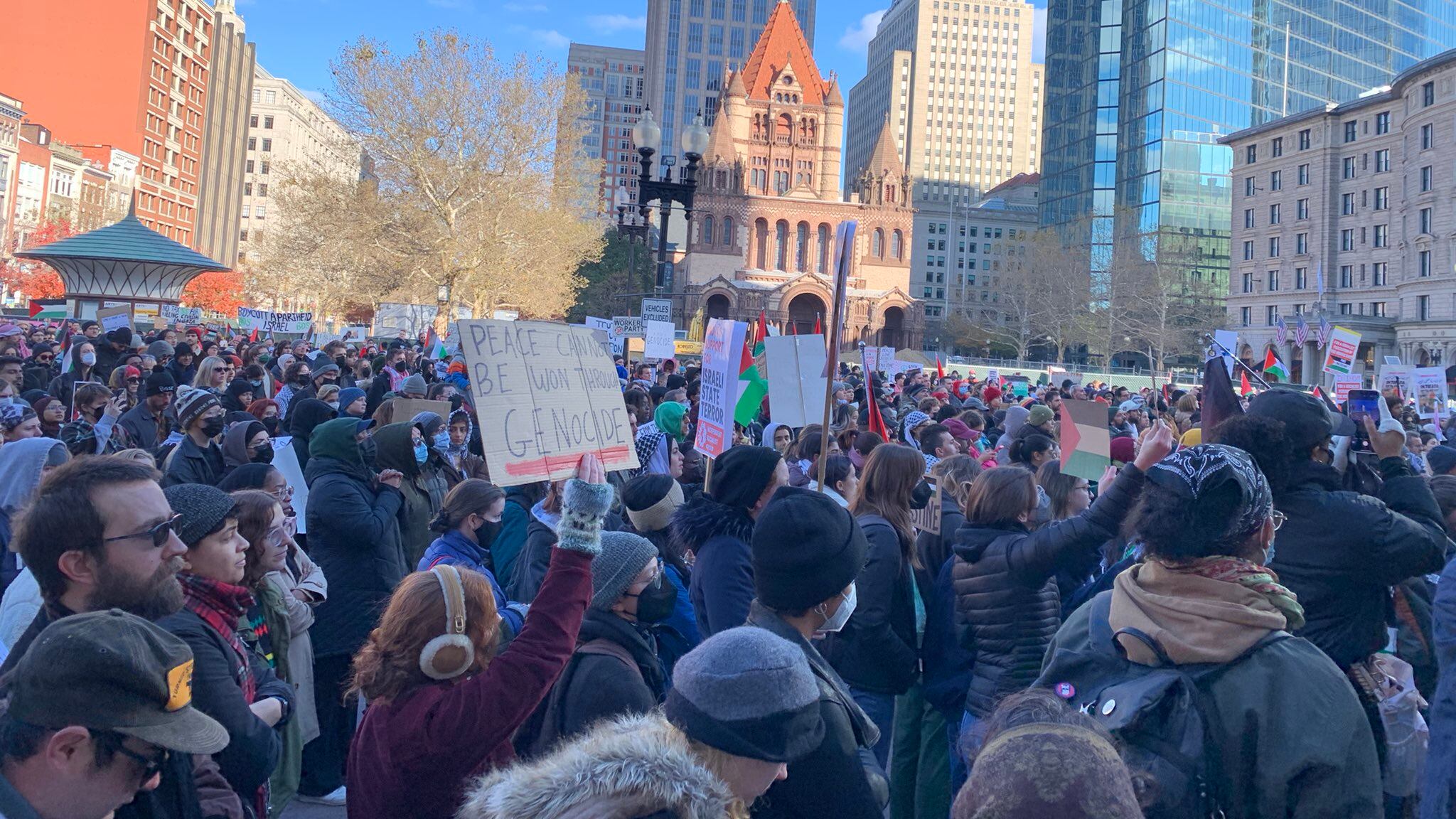 Pro-Palestinian groups marched from Copley Square down Newbury Street and continued over the Mass. Ave. Bridge into Cambridge shutting down several streets. The group passed through with flags and signs that described Israel’s military campaign as “genocide.”