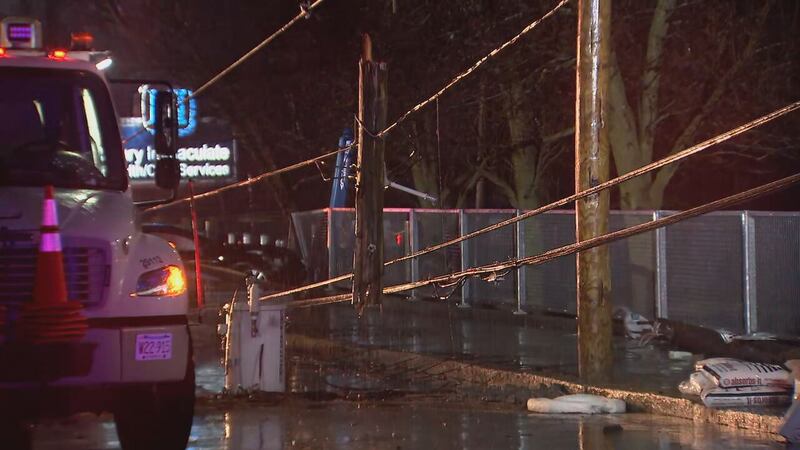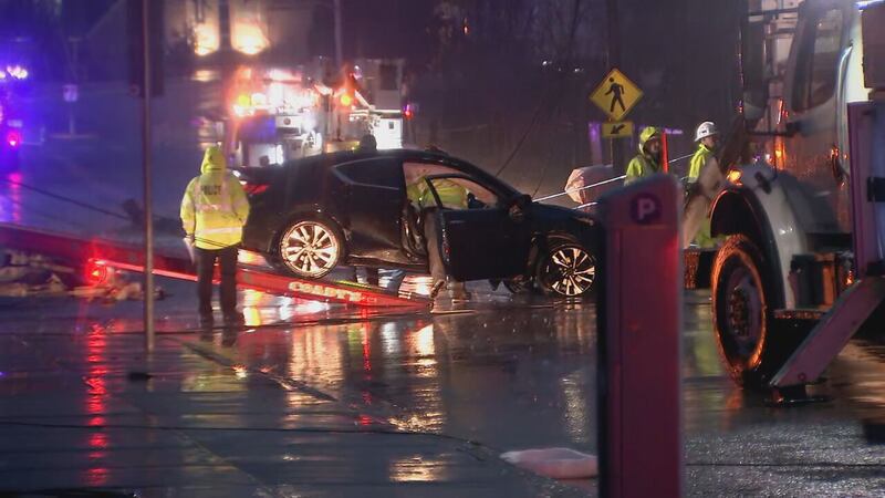 Video from the scene showed emergency responders investigating the wrecked car and working to tow it away. Multiple bucket trucks were also spotted on the street as crews worked to restore power.