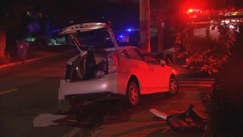 The other car involved in the crash was a white Prius. It smashed into a utility pole. Both the front and back of the car were heavily damaged.