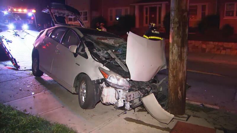 BELMONT, Mass — Two people were taken to the hospital after an SUV barreled into a home and another vehicle struck a utility pole in Belmont overnight.