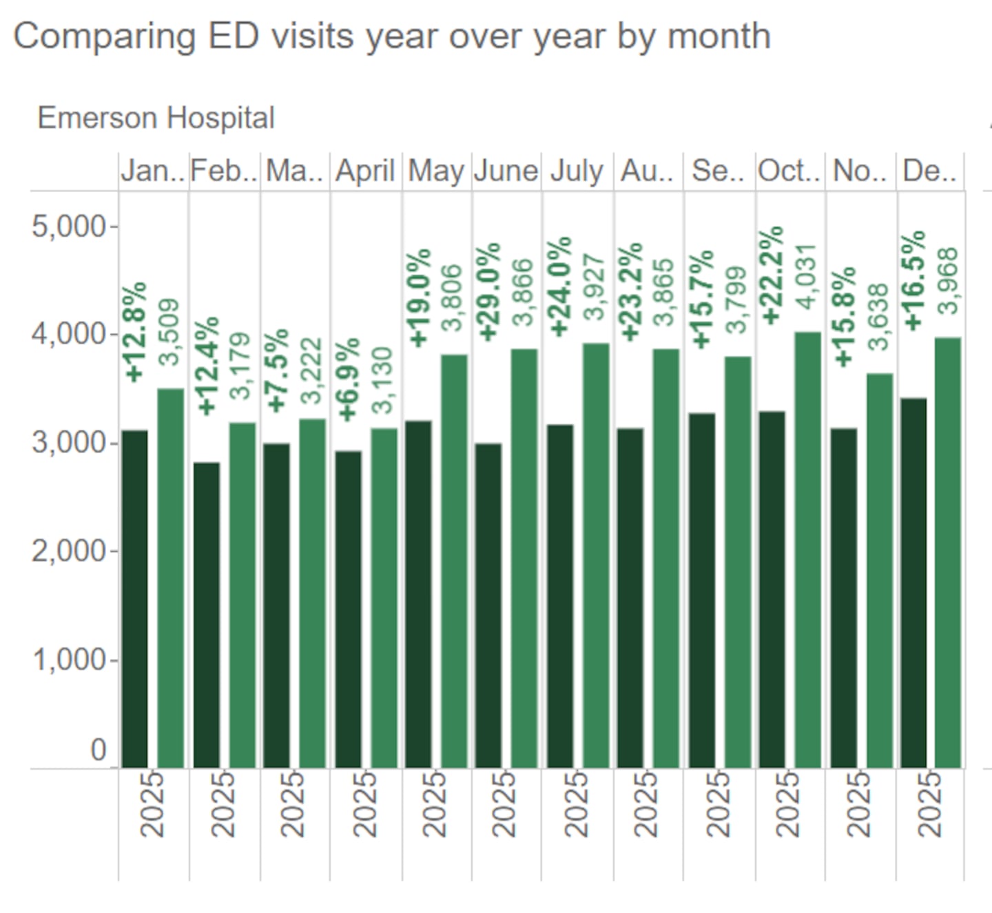 Emerson Hospital saw an average 17.08% monthly increase in emergency department visitors in last year compared to 2024.
