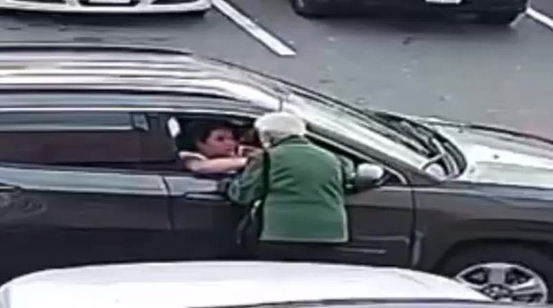 You can see the woman in the car removing the victim’s own necklace while replacing it with a piece of costume jewelry.