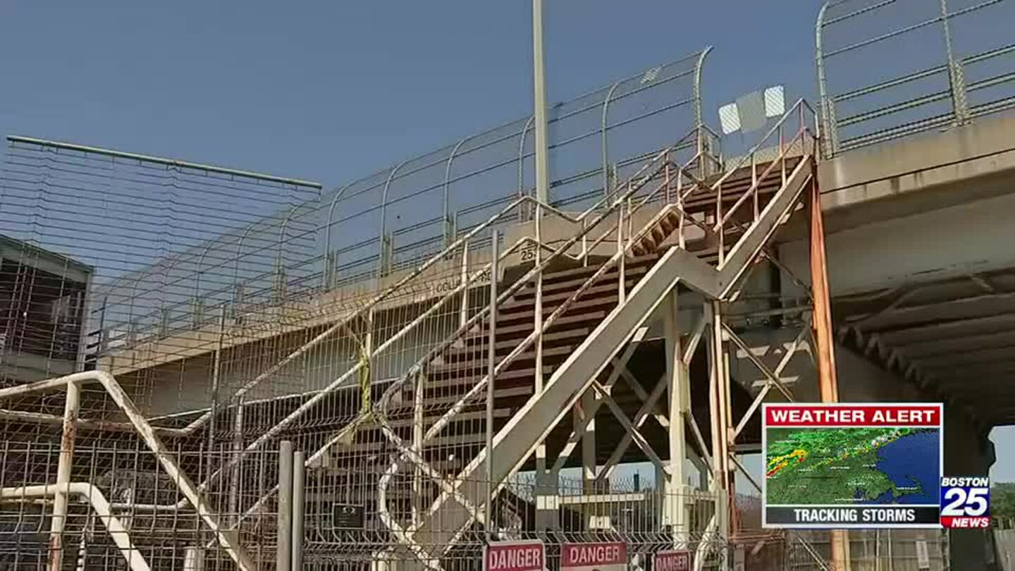 Boston 25 also obtained several pictures of the scene. Some of the photos show the rusted-out staircase. Others show several treads that had fallen to the ground below. Another shows the fence blocking the stairs but with a gap that was easily accessible.