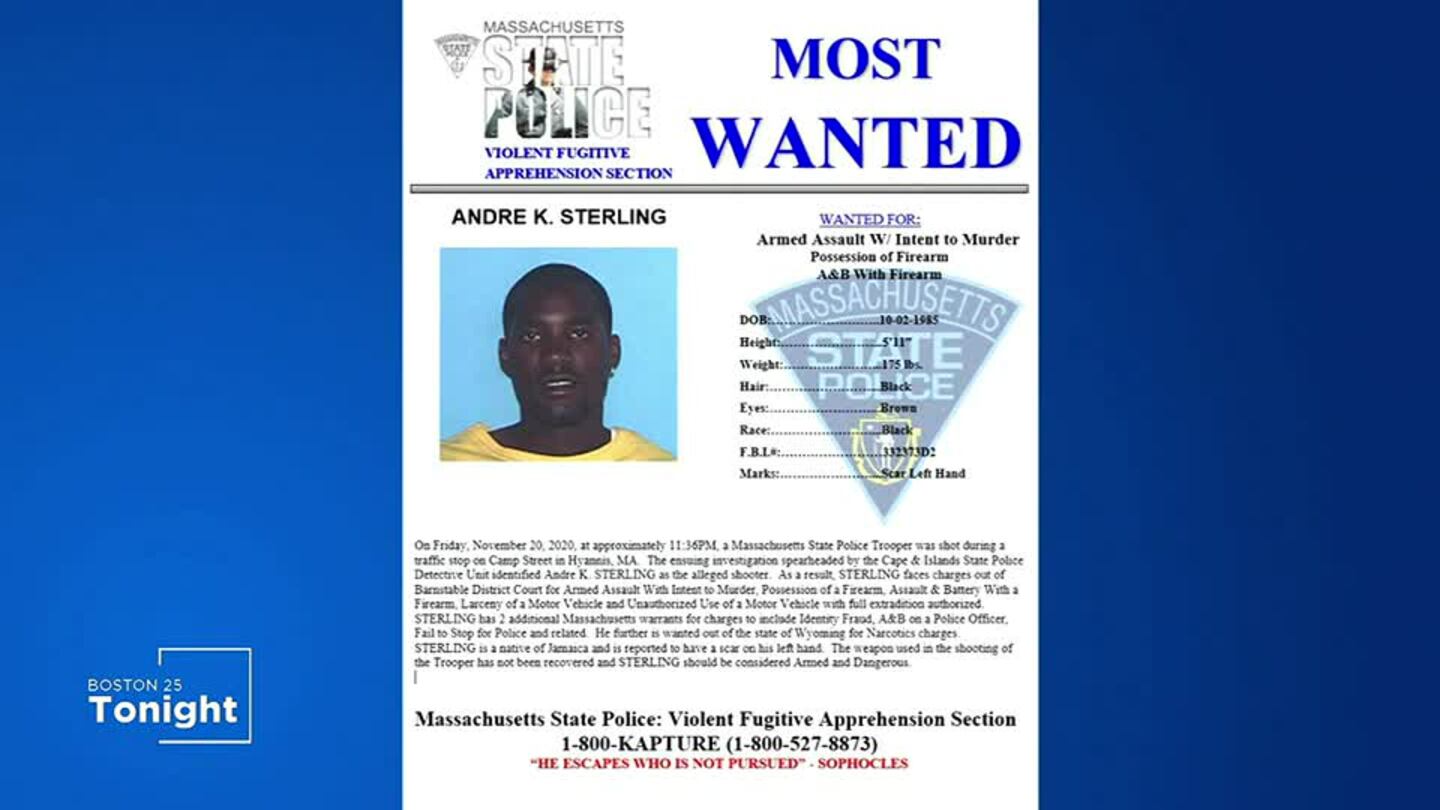Sterling was wanted on charges connected to a Nov. 20 traffic stop in Hyannis where he allegedly shot trooper John Lennon, 28, in the hand and then fled.