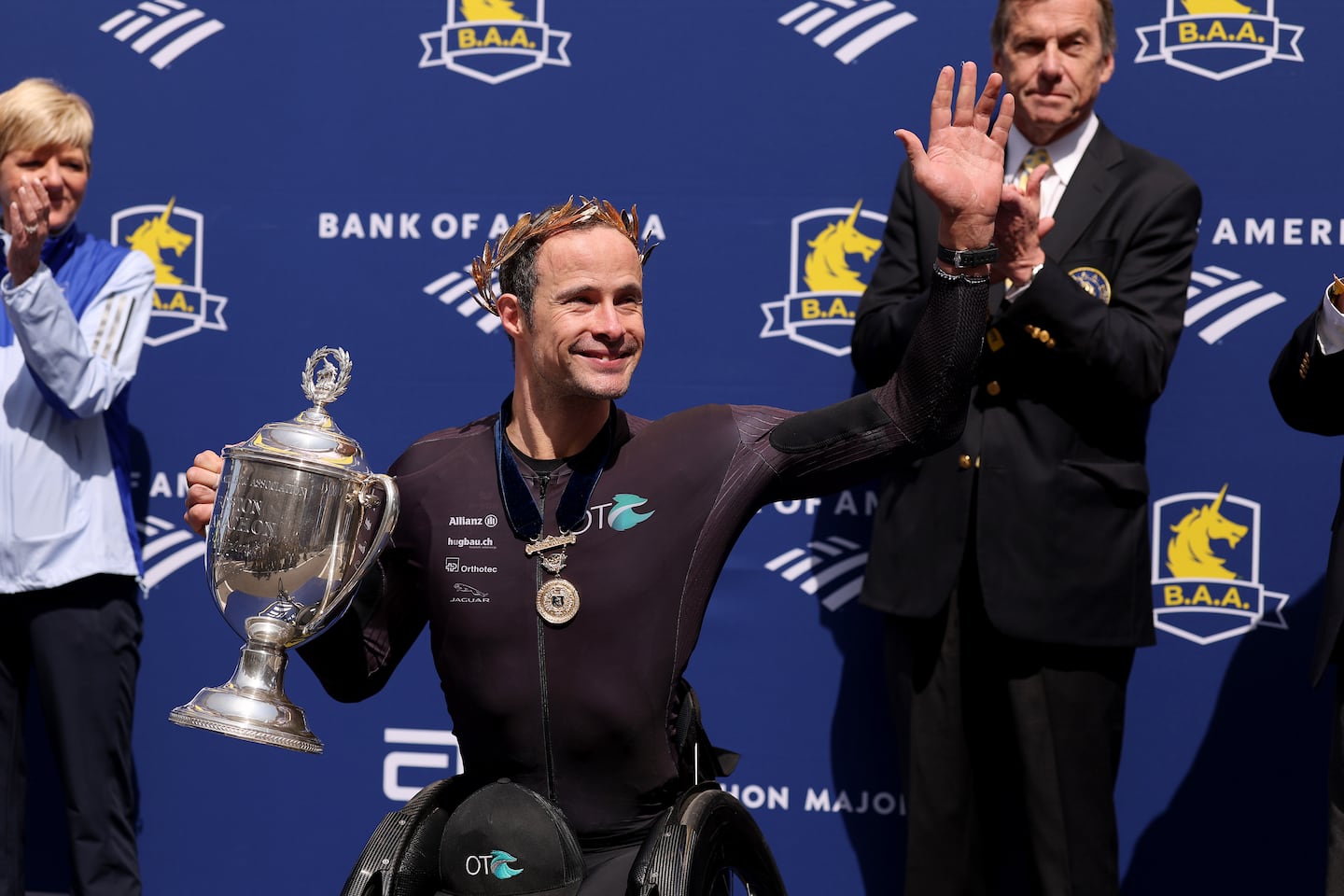 The 39-year-old Hug crossed the finish line in downtown Boston to claim his fifth consecutive win in the race on the 50th anniversary of the first official wheelchair finisher in Boston. Daniel Romanchuk of the United States was second in 1:25:58, followed by Jetze Plat of the Netherlands in 1:30:16.