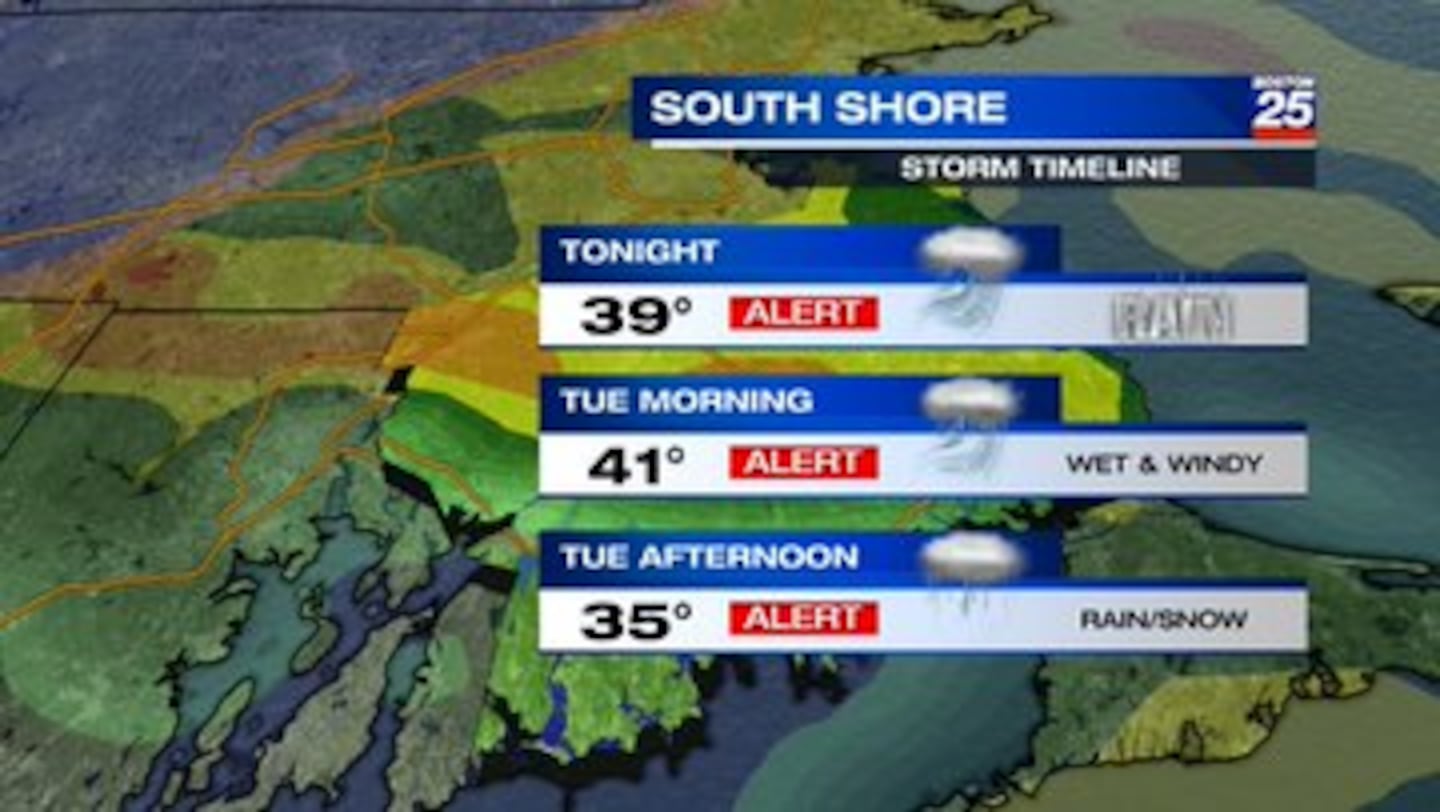 Communities on the South Shore saw rain overnight before things turned windy Tuesday morning. Snow will begin to mix in with the rain by Tuesday afternoon.