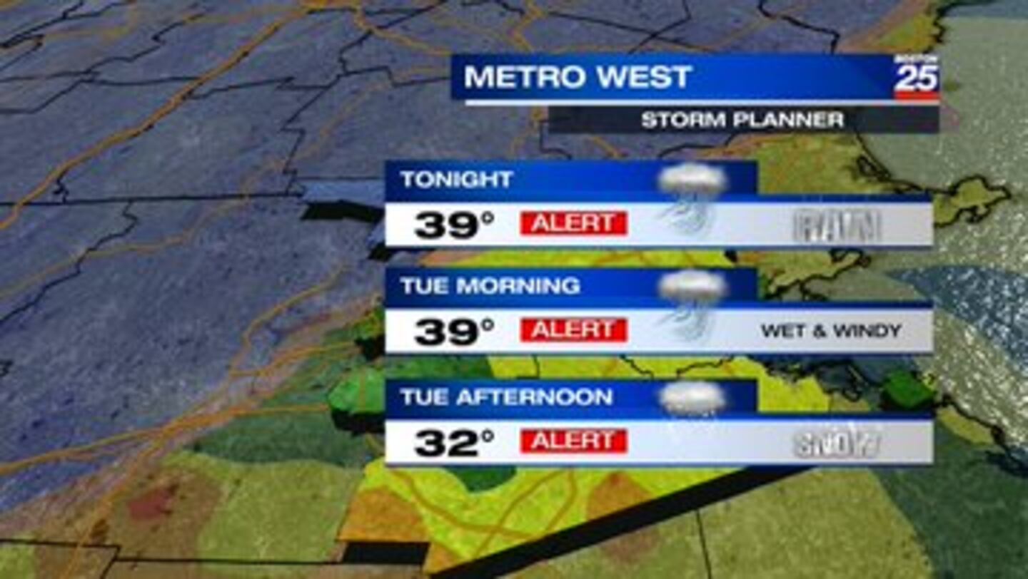 The Metro West saw rain Monday night and things turn windy by Tuesday morning. The rain will give way to snow by Tuesday afternoon.
