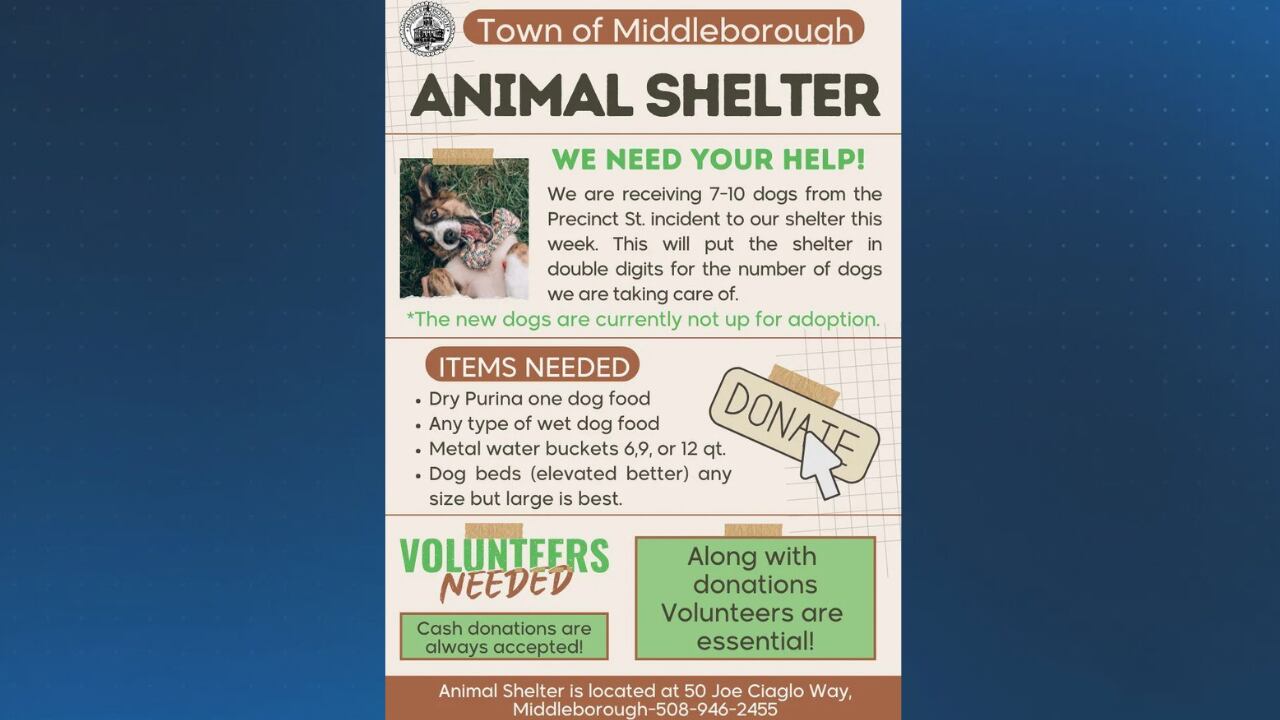 Middleborough, Mass, — The Town of Middleborough is currently seeking donations for dogs that were recently rescued from a home on October 18.