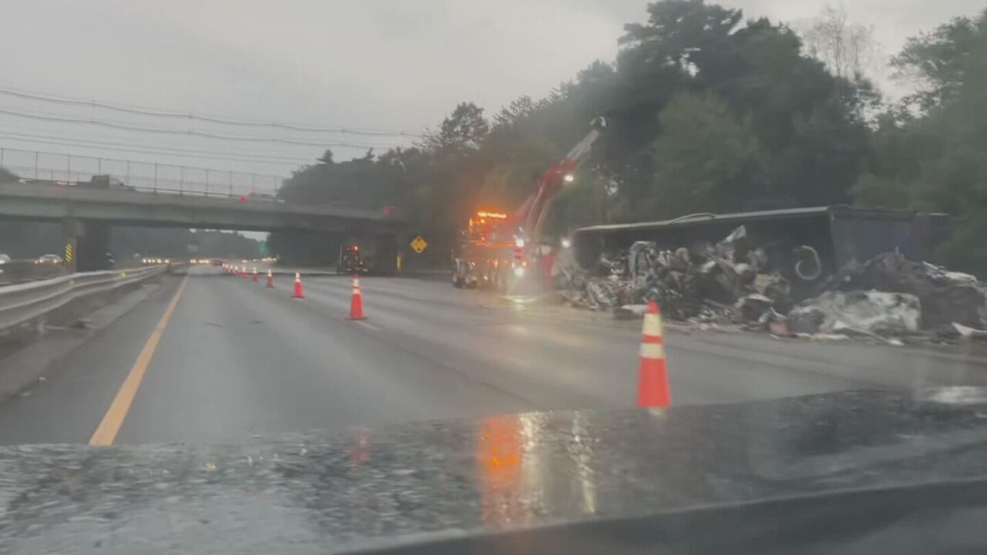 Emergency crews responding to a report of a crash on the southbound side of the highway near Exit 35 just before 5 a.m. found a tractor-trailer flipped over on its side and debris littering the travel lanes, according to Massachusetts State Police.