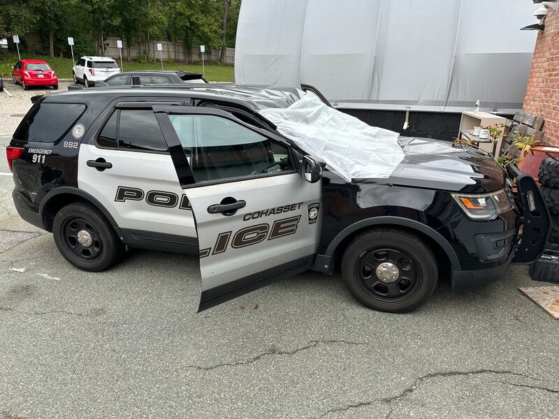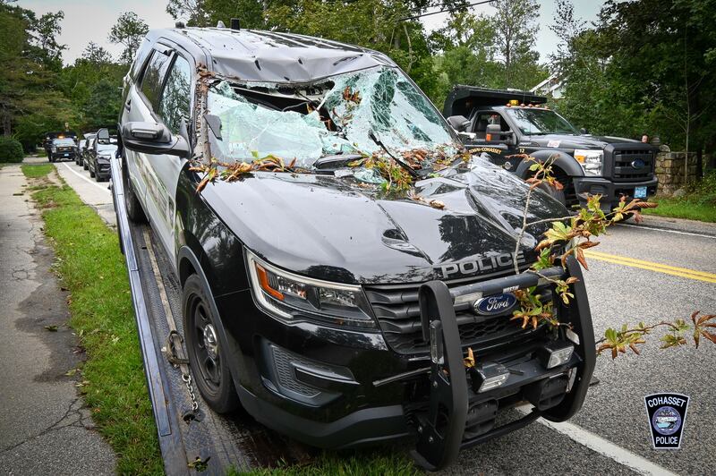 COHASSET, Mass. — A Cohasset police officer saw the giant tree falling towards him and his cruiser, and ran.