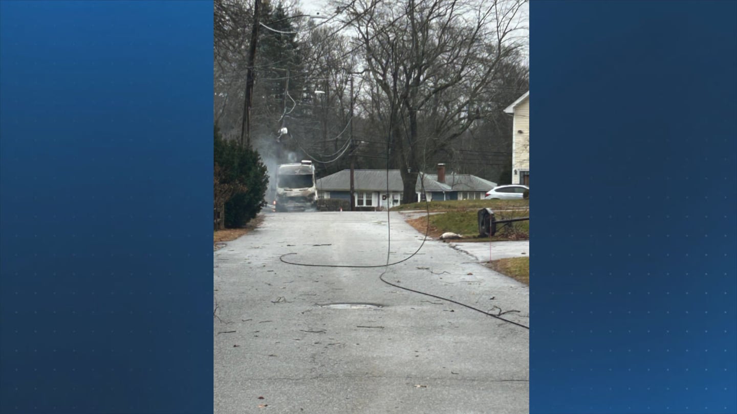 FRAMINGHAM, Mass. — A vehicle in Framingham caught fire, Friday, after strong winds brought down power lines in the area.