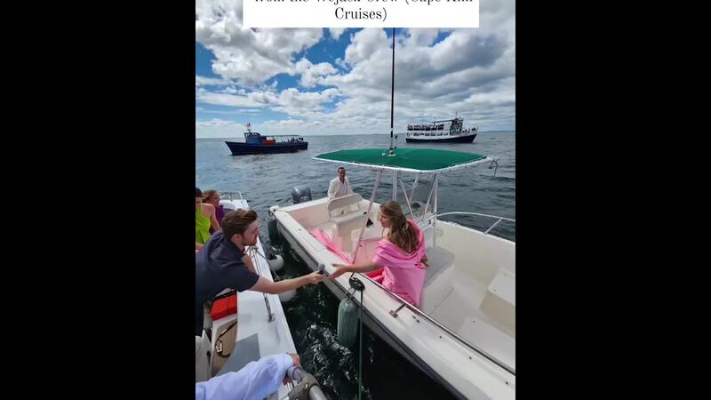 Before the show-stopping reception, Kayla and Jon were married at sea surrounded by friends and family. Captain Jeff Brown with Cape Ann Cruises told Boston 25 that Kayla, her close family and bridesmaids boarded the 46-passenger Wejack yacht before the bride-to-be climbed into her fiancee’s boat to exchange vows. The two then sped off, spending their first moments as man and wife on the high seas before regrouping with the rest of the party at Kowloon.