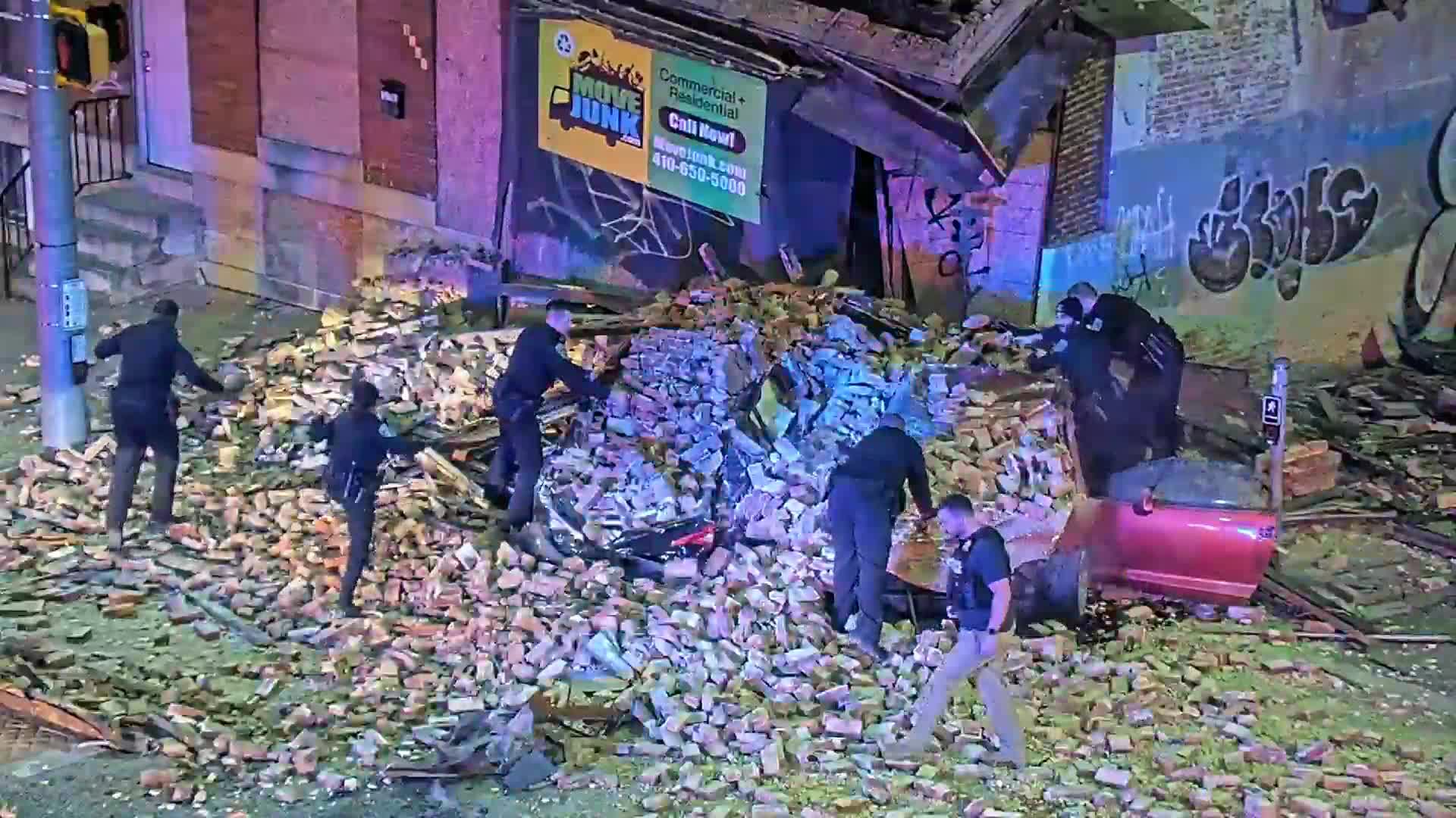 BALTIMORE — Law enforcement officials on Thursday released new video from a wild police chase in Baltimore, Maryland, that showed the driver of a stolen vehicle slam into another car, a pedestrian, and then a vacant building, causing a partial collapse.