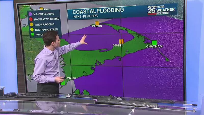 A coastal flooding warning is in effect for Barnstable, Dukes, Norfolk, Plymouth, Nantucket, Eastern Essex, and Suffolk counties from noon to 5 p.m. on Tuesday.