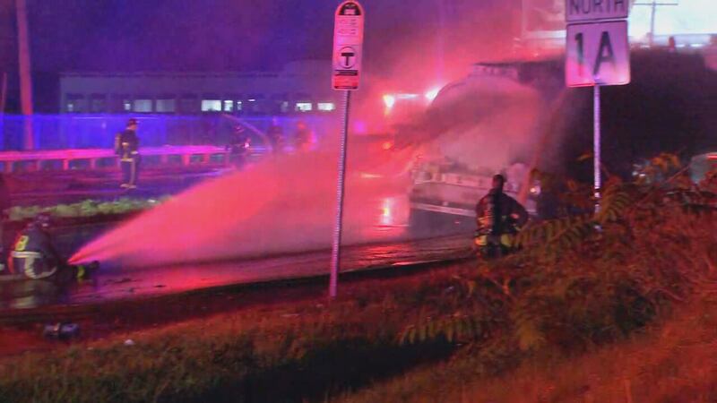 A crash involving a fuel tanker and a car caused both to catch fire on Route 1A. The woman in the car suffered burns and was taken to the hospital. A small section of Rte 1A NB at Boardman St will be closed for about two hours according to @BostonFire. @boston25 pic.twitter.com/sVW1pmQZzC
