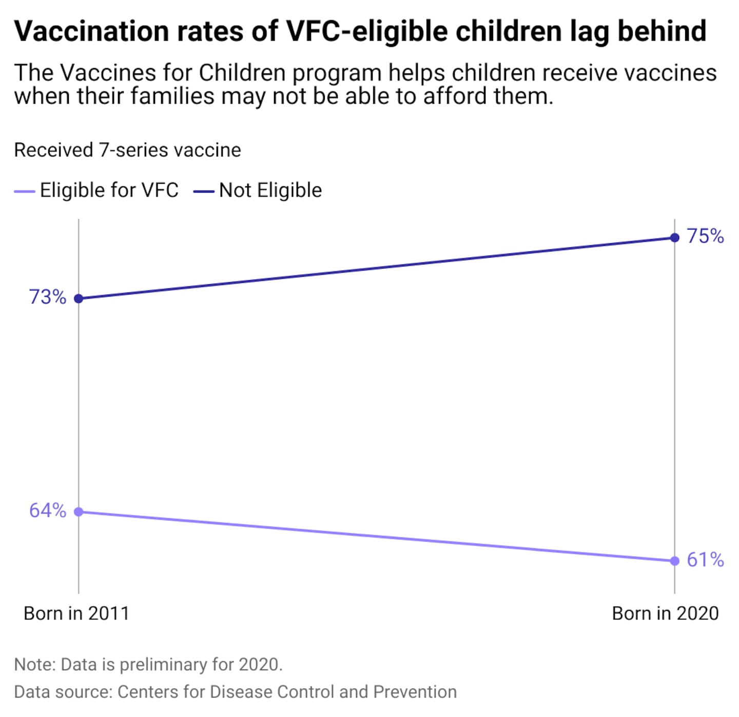 Although the CDC provides funding for over 60 programs that put the VFC program into action across the country, vaccination rates for those eligible remain much lower than the overall population—and this discrepancy grows each year. For those born in 2020, just 3 in 5 (61%) VFC-eligible children completed their 7-vaccine series, compared to 3 in 4 of those ineligible for the program. VFC-eligible kids face difficulties in completing vaccines that require multiple doses, as well as doses scheduled after the first year.