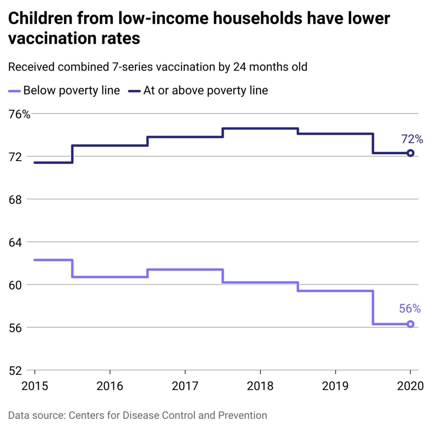 Practical considerations can add more challenges. Those experiencing poverty tend to have less flexible work schedules, and they may lack transportation or live in more rural areas that are further from doctors' offices. Families living below the federal poverty level also tend to move more frequently, making it difficult to keep up with a paper trail of their vaccination history.