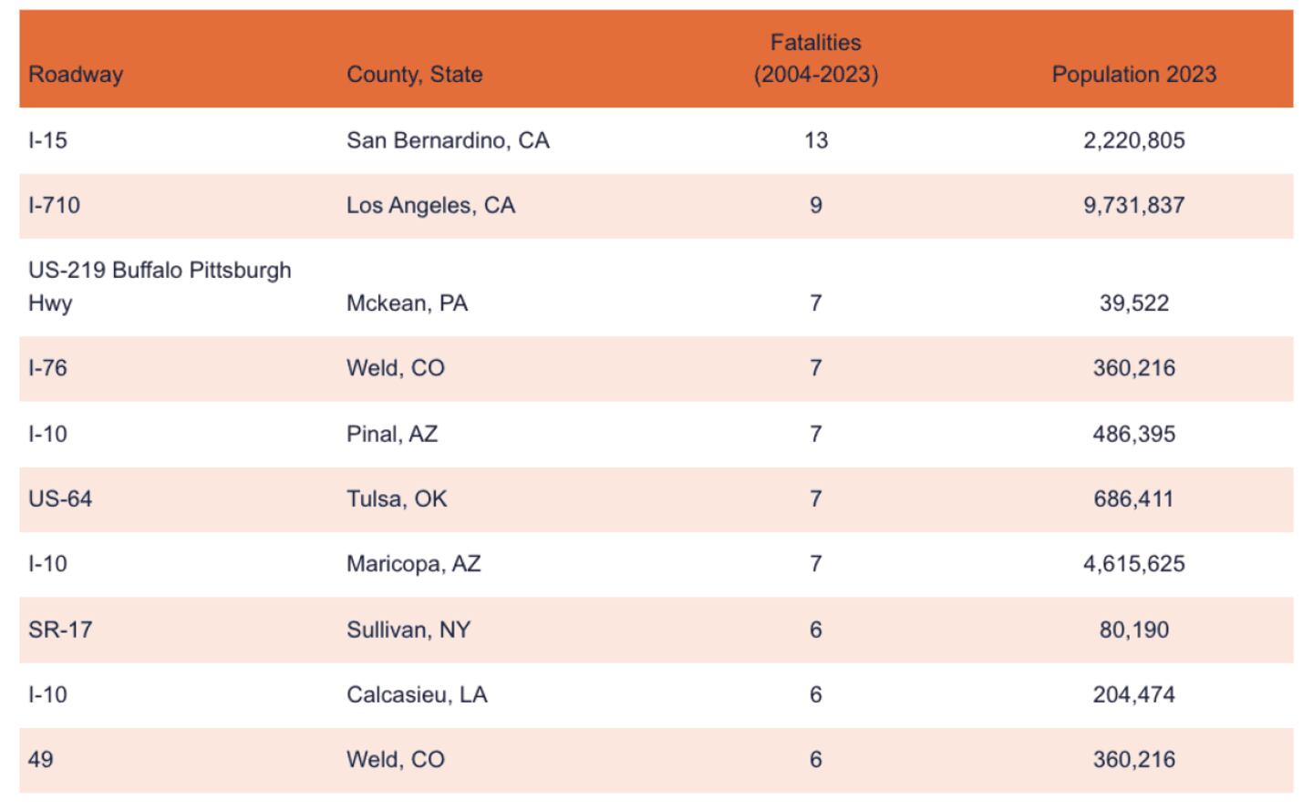 Six of the most dangerous roads are outside of populated metro areas