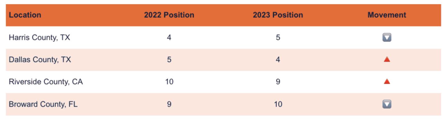 For the ranking of the most dangerous counties during Labor Day, Harris County, Texas, moved down from fourth place in 2022 to fifth place in 2023, swapping positions with Dallas County, Texas, which rose from fifth to fourth. Similarly, Riverside County, California, climbed from 10th to ninth, exchanging places with Broward County, Florida, which dropped from ninth to 10th.