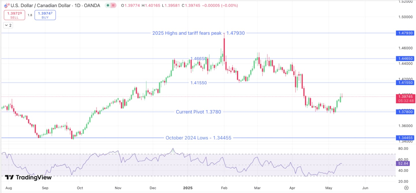 As explained earlier, fears of record-high tariffs led to a massive gap in the loonie on Feb. 3, 2025, where it found some relief. Prices moved toward 1.41650 and formed a more volatile range, as prices eventually broke support after Liberation Day.
