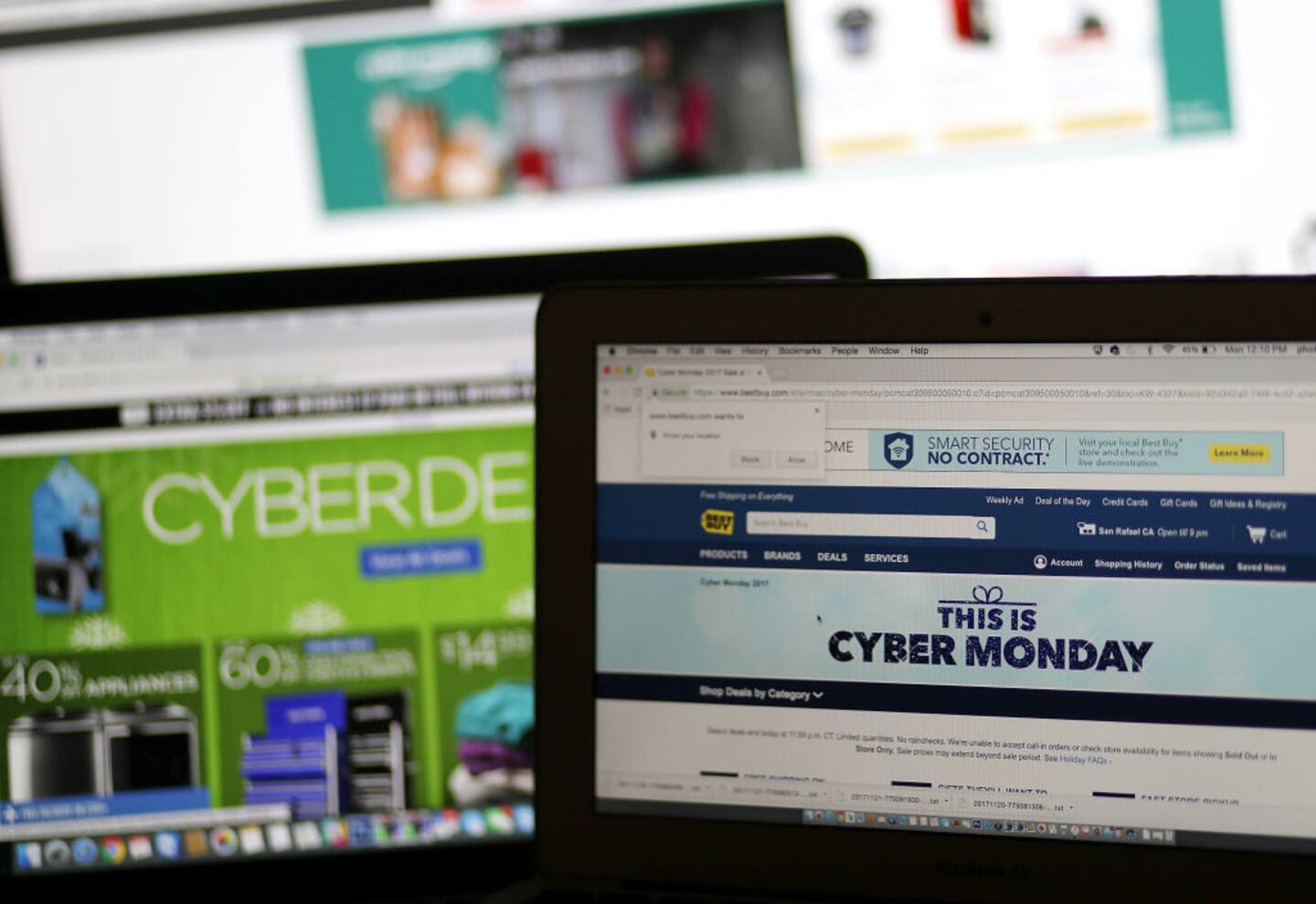 In this photo illustration, an ad seen on the Best Buy website for a Cyber Monday sale is displayed on laptop computers on November 27, 2017 in San Anselmo, California.
