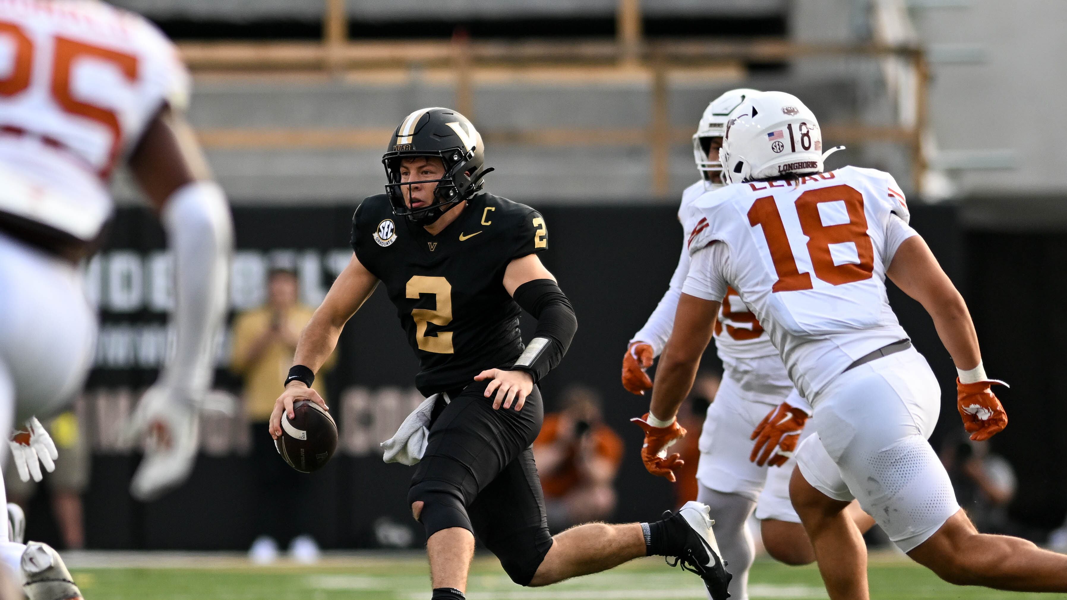 Texas v Vanderbilt NASHVILLE, TENNESSEE - OCTOBER 26: Diego Pavia #2 of the Vanderbilt Commodores runs the ball against the Texas Longhorns in the first half at FirstBank Stadium on October 26, 2024 in Nashville, Tennessee. (Photo by Carly Mackler/Getty Images) (Carly Mackler/Getty Images)