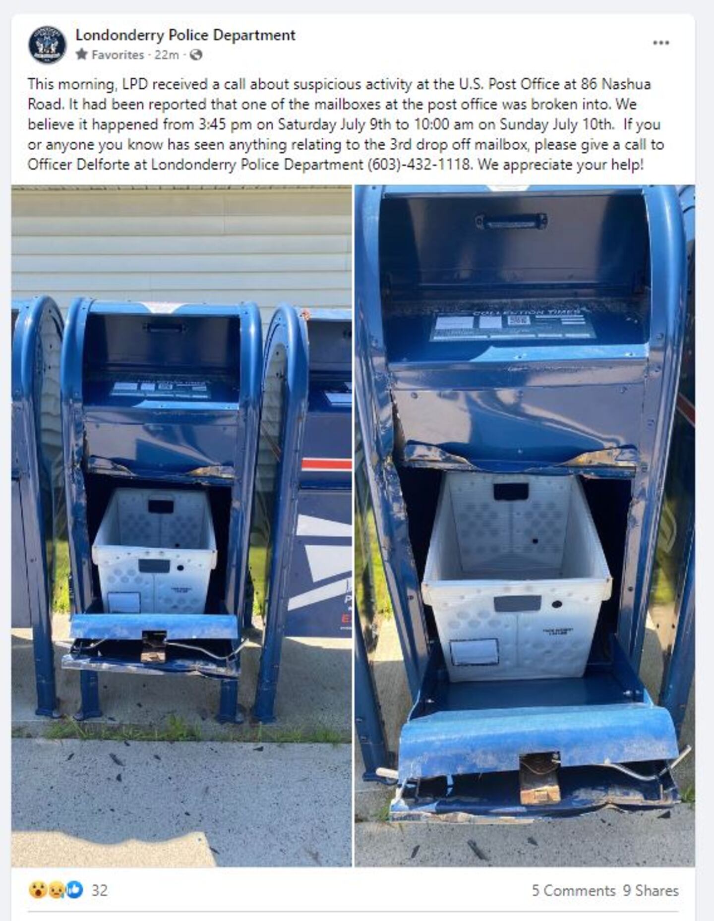 Londonderry, NH — Police in Londonderry, NH are looking for anyone who is responsible for breaking into a mailbox right in front of their local post office.
