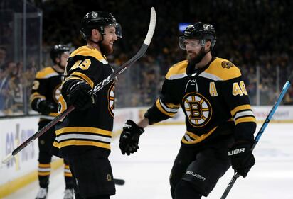 Boston Bruins' Matt Grzelcyk, left, celebrates his goal against the Carolina Hurricanes with David Krejci during the second period in Game 2 of the NHL hockey Stanley Cup Eastern Conference final series, Sunday, May 12, 2019, in Boston. (AP Photo/Charles Krupa)
