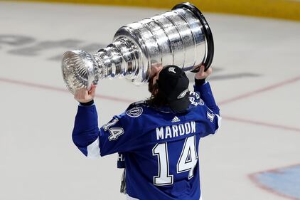 2021 NHL Stanley Cup Final - Game Five TAMPA, FLORIDA - JULY 07: Pat Maroon #14 of the Tampa Bay Lightning hoists the Stanley Cup after defeating the Montreal Canadiens 1-0 in Game Five of the 2021 NHL Stanley Cup Final at Amalie Arena on July 07, 2021 in Tampa, Florida. (Photo by Bruce Bennett/Getty Images) (Bruce Bennett/Getty Images)