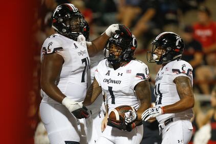 Cincinnati v Miami Ohio OXFORD, OH - SEPTEMBER 16: Korey Cunningham #71 celebrates with Kahlil Lewis #1 of the Cincinnati Bearcats after a touchdown against the Miami Ohio Redhawks during the second half at Yager Stadium on September 16, 2017 in Oxford, Ohio. (Photo by Michael Reaves/Getty Images) (Michael Reaves/Getty Images)