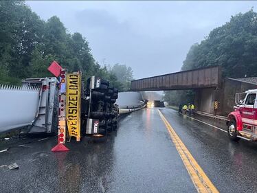 Photos: Tractor-trailer hauling windmill blade overturns on Maine highway