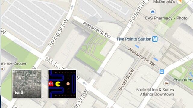 To play, go to Google Maps and zoom in to your desired location. Then look for a "Pac-Man" view in the lower left where the Satellite View is usually found. The game will show up over the street grid that you have on your screen. Use your arrow keys to get around the maze and escape the ghosts. Unlike drivers in downtown's mazes of streets, Pac-Man doesn't have to worry about one-way signs.