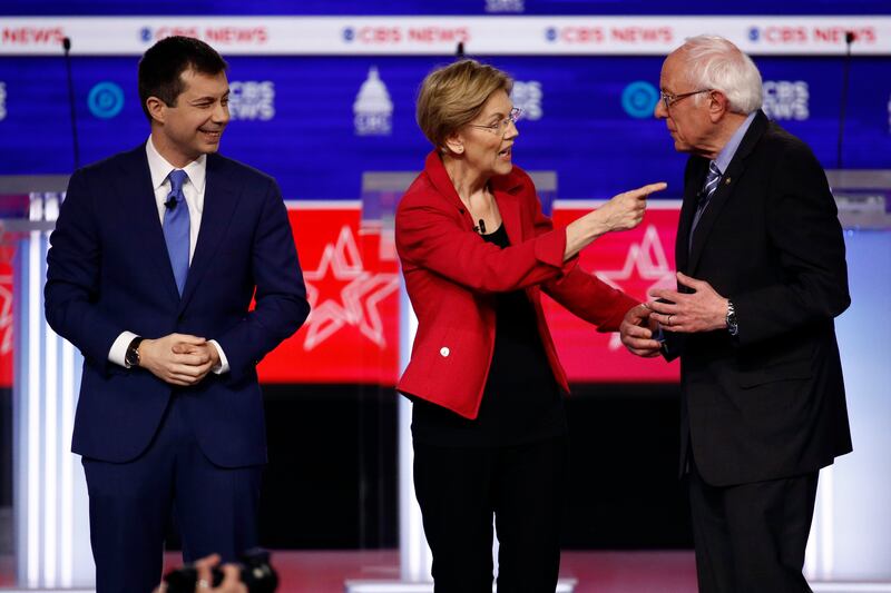 South Carolina debate From left, Democratic presidential candidates former South Bend Mayor Pete Buttigieg, watches as Sen. Elizabeth Warren, D-Mass., and Sen. Bernie Sanders, I-Vt., talk before a Democratic presidential primary debate at the Gaillard Center, Tuesday, Feb. 25, 2020, in Charleston, S.C., co-hosted by CBS News and the Congressional Black Caucus Institute. (AP Photo/Patrick Semansky)