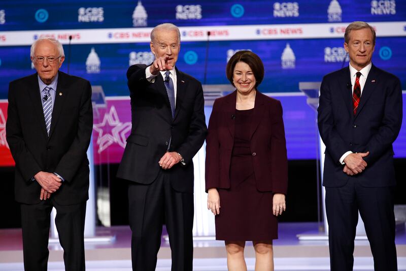 South Carolina debate From left, Democratic presidential candidates, Sen. Bernie Sanders, I-Vt., former Vice President Joe Biden, Sen. Amy Klobuchar, D-Minn., and businessman Tom Steyer participate in a Democratic presidential primary debate at the Gaillard Center, Tuesday, Feb. 25, 2020, in Charleston, S.C., co-hosted by CBS News and the Congressional Black Caucus Institute. (AP Photo/Patrick Semansky)