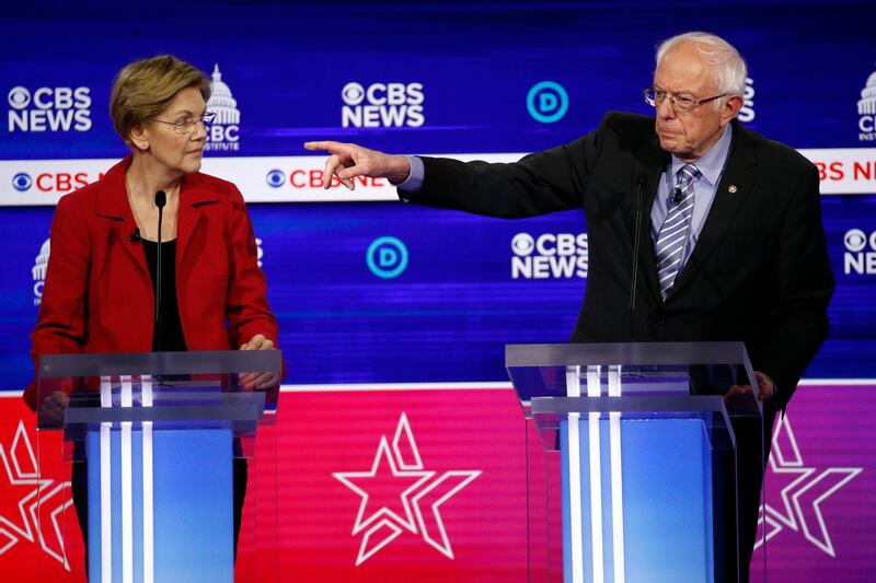 South Carolina debate Democratic presidential candidates Sen. Elizabeth Warren, D-Mass., listens as Sen. Bernie Sanders, I-Vt., speaks during a Democratic presidential primary debate at the Gaillard Center, Tuesday, Feb. 25, 2020, in Charleston, S.C., co-hosted by CBS News and the Congressional Black Caucus Institute. (AP Photo/Patrick Semansky)