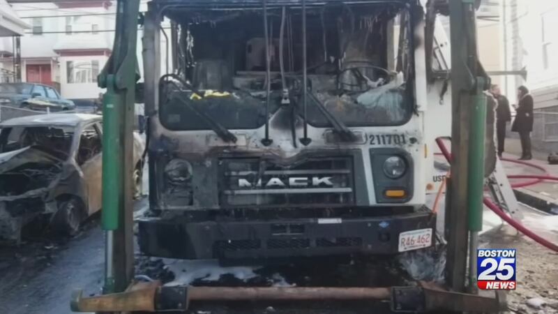 FALL RIVER, Mass. — A Waste Management truck caught on fire Tuesday morning, with billowing flames spreading to nearby homes and two parked vehicles.