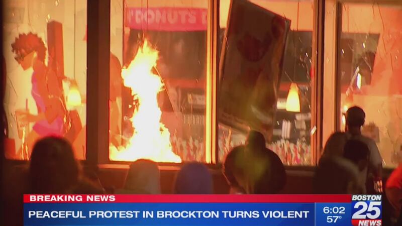 In Brockton Tuesday evening, protesters began throwing objects and lighting flares at police officers as they stood outside the Brockton police station on Commercial Street. Later, they set one Dunkin Donuts on fire.