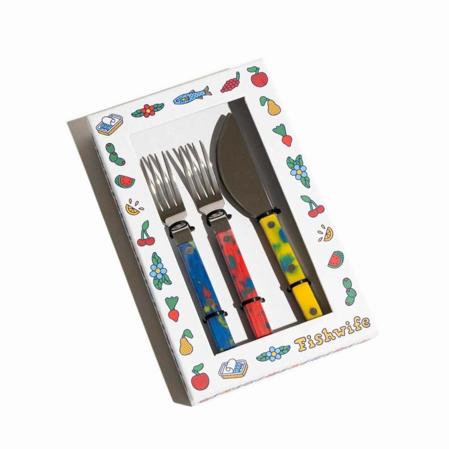“We always want to make sure our merch either reinforces a core brand pillar, or supports it in the use of our product. So, the cutlery, tongs, and serving board are the perfect tools for a lovely snack plate or tinned fish party—behavior we want to encourage,” says Millstein.