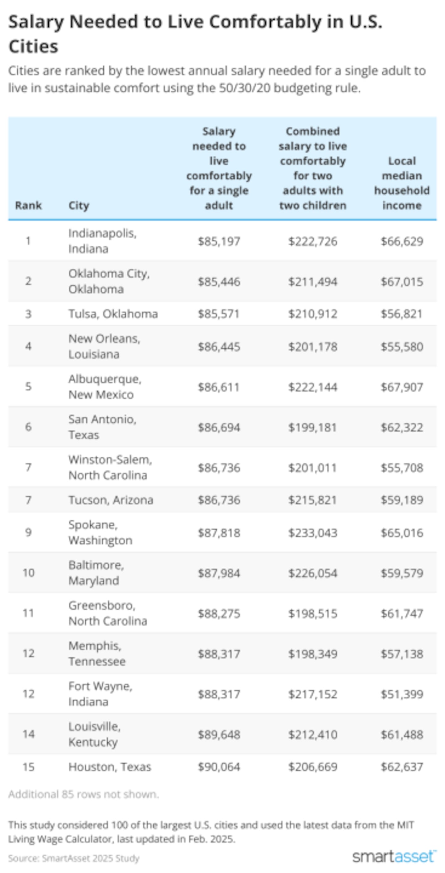 • Indianapolis is least expensive for an adult to live comfortably. It takes an estimated salary of $85,197 to comfortably support a single adult in the capital of Indiana, the lowest among large U.S. cities. However, for a family of four, the city has the 28th highest salary needed at $222,726. Meanwhile, the city's median household income was last reported at a fraction of that at $66,629.