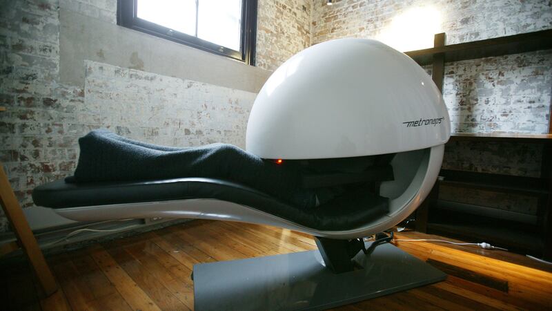 The pods, made by MetroNaps, include a chair that reclines and is covered by a sensory-reduction bubble that envelops the napper's head and body, The Santa Fe New Mexican reported.
