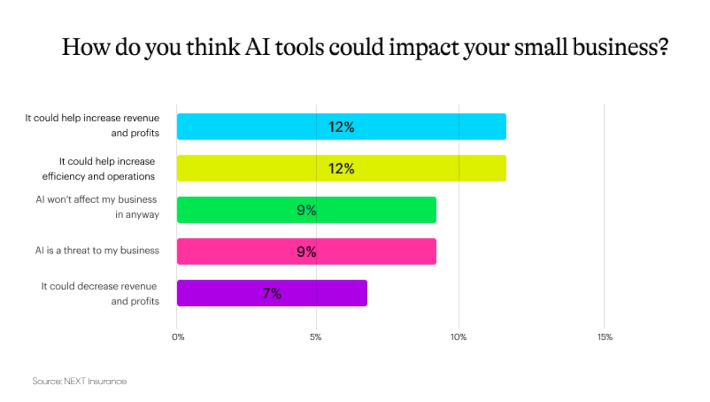 NEXT’s survey data reveals small business owners have mixed feelings about AI’s impact. While some owners (12%) believe AI could boost revenue, and operational efficiency (12%), many remain unsure or skeptical about its value. Some believe AI won’t affect their business in any way (9%), believe it’s a threat to their business (9%) or that it will decrease their profits (7%).