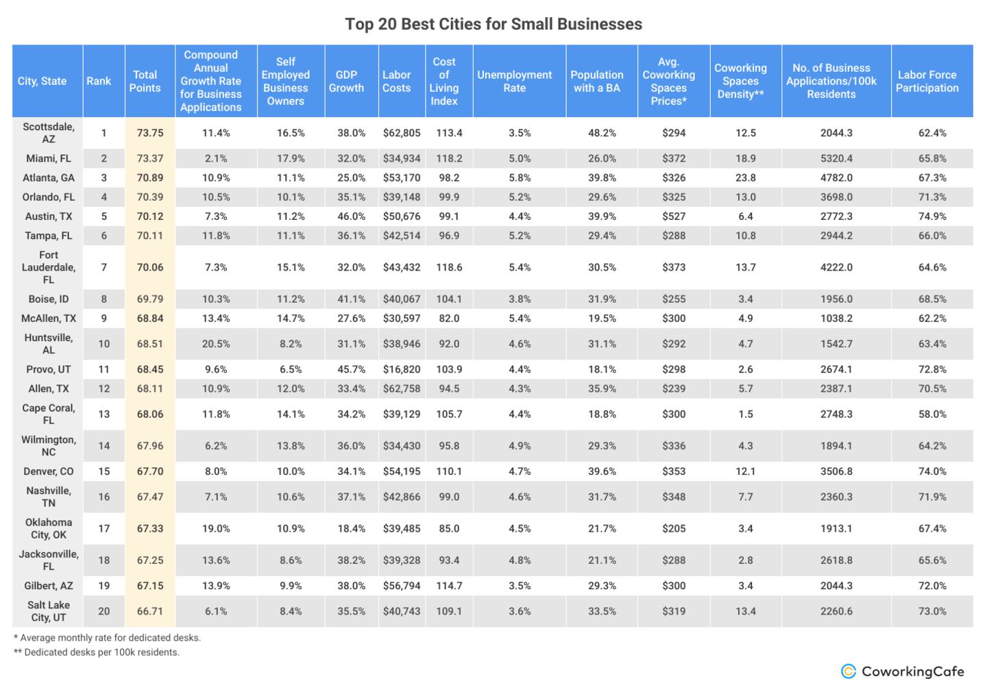 With this in mind, CoworkingCafe set out to find the top U.S. cities where aspiring business owners can thrive. It analyzed 136 cities across various key metrics, including gross domestic product (GDP), number of business applications, labor costs and more.