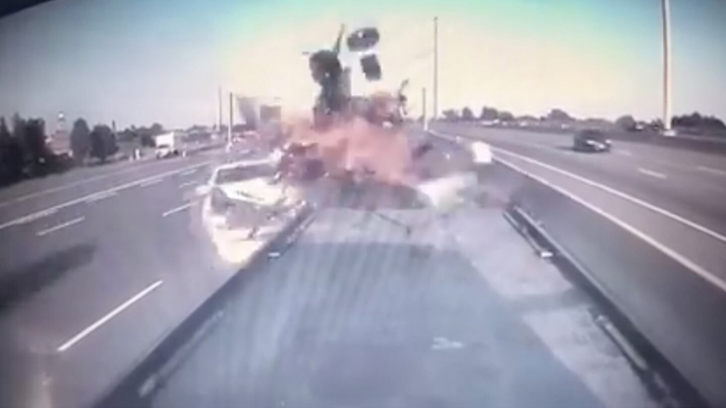 TORONTO — A disabled pickup truck was sitting alongside a highway in Toronto waiting for a tow truck. What happened as the tow truck driver was getting ready to help the stranded motorist is something you have to see to believe.