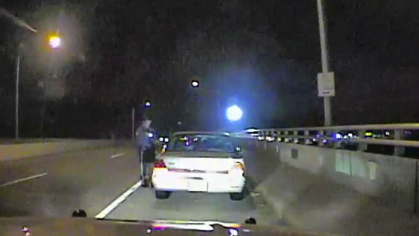 In this image taken from a Neptune City, N.J., police officer's dashboard camera early Dec. 3, 2016, an officer examines the vehicle belonging to Sarah Stern, 19, after it was found abandoned on the Route 35 Bridge in Belmar. Stern's friend and former classmate, Liam McAtasney, was found guilty Feb. 26, 2019, of strangling Stern and throwing her body from the bridge. The 21-year-old McAtasney faces life in prison at his May sentencing. Monmouth County Prosecutor's Office/The Asbury Park Press via AP