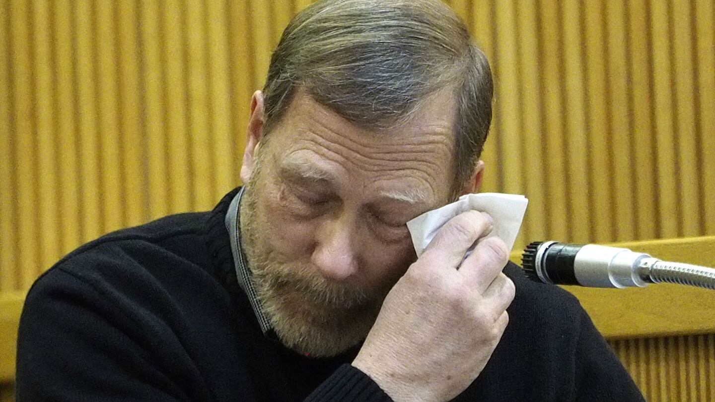 Michael Stern, the father of murder victim Sarah Stern, 19, of Neptune City, N.J., wipes tears from his eyes as he testifies for the prosecution Feb. 5, 2019, during the trial of 21-year-old Liam McAtasney at the Monmouth County courthouse in Freehold, N.J. McAtasney, a childhood friend of Sarah's, was convicted Tuesday, Feb. 26, 2019, of strangling the victim over money Dec. 2, 2016, and throwing her body off a bridge. Sarah Stern's remains have never been found. Patti Sapone/NJ Advance Media via AP