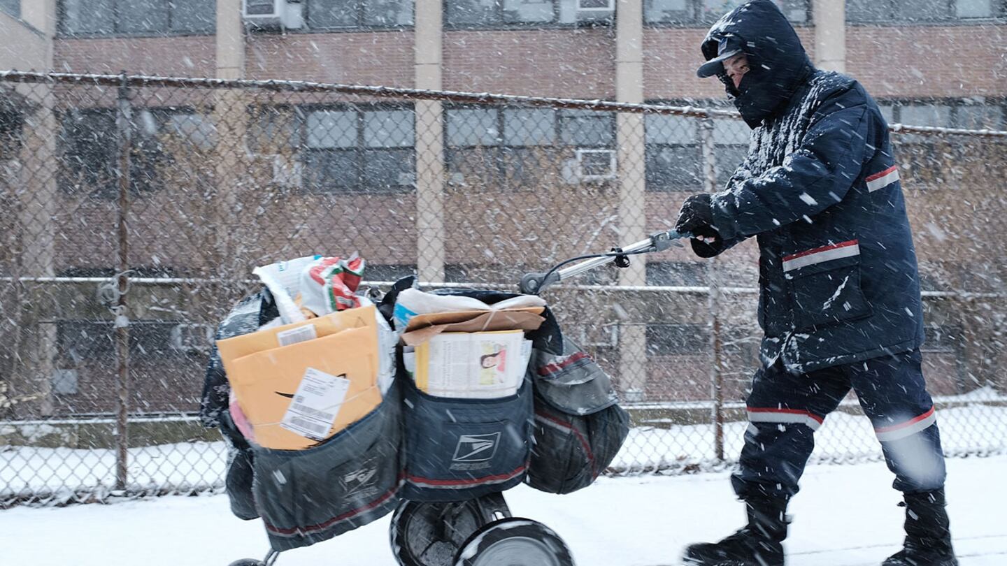FILE PHOTO: A mail carrier walks through the snow on March 21, 2018 in the Brooklyn borough of New York City. Despite dangers, mail delivery is among the services that continues when weather gets frigid.