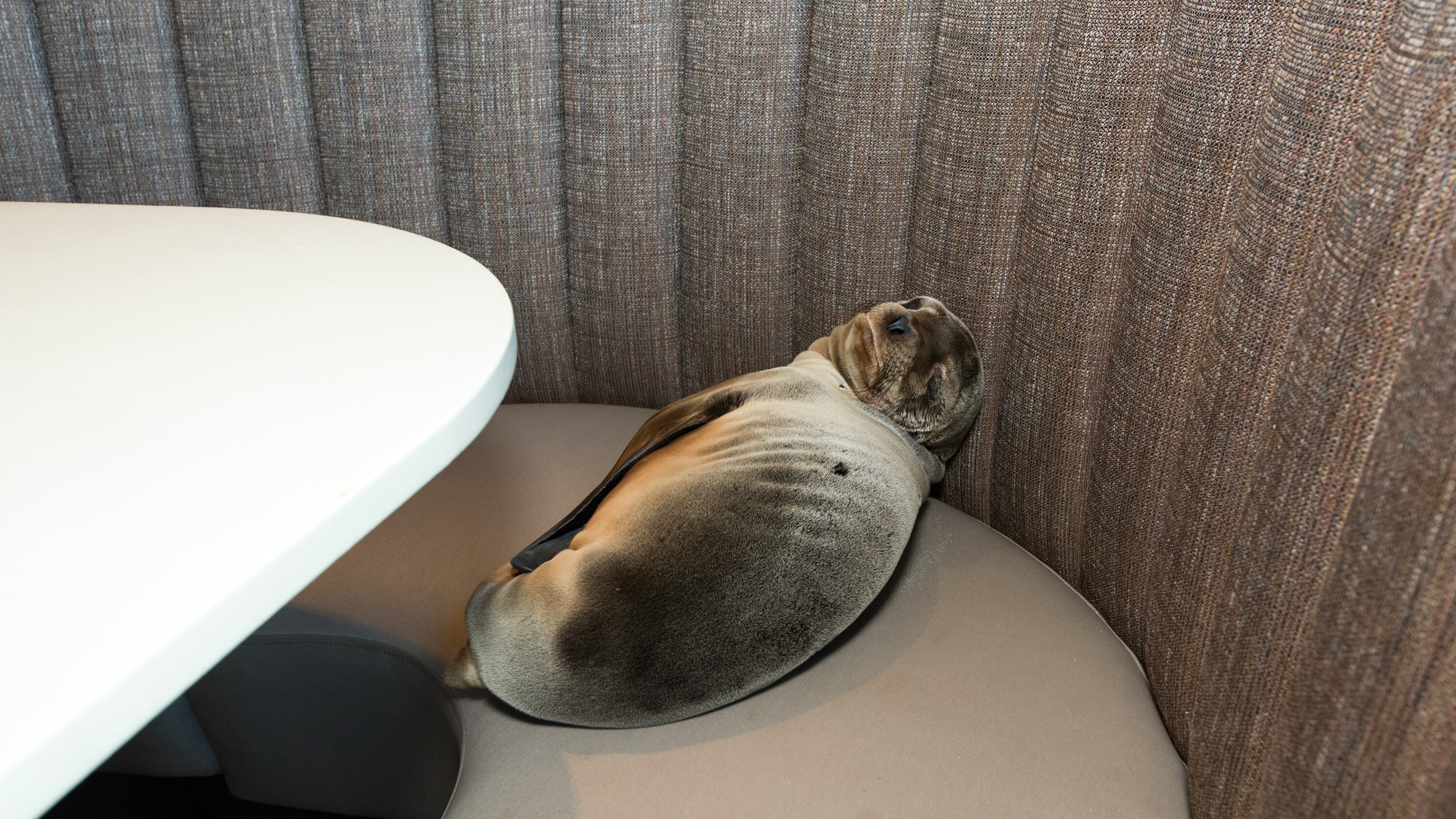 8-month-old female sea lion pup is shown where it was found sleeping in a booth of the Marine Room, an upscale restaurant in the La Jolla neighborhood of San Diego, Thursday, Feb. 4, 2016. (Mike Aguilera/SeaWorld via AP)